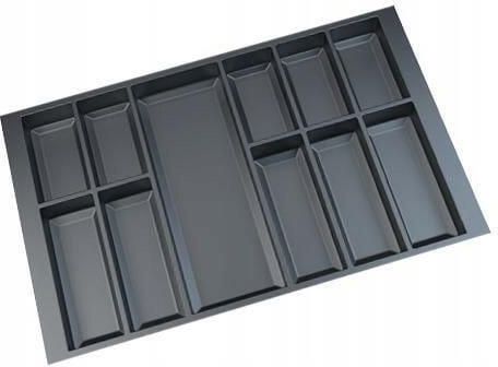 Wkład CLASSICO 800 do szuflady Merivobox o wymiarach 707 x 474/ antracyt wkłady na sztućce do szuflad kuchennych Wytłoczka na sztućce i akcesoria kuchenne Classico jest dopasowana do szuflad Merivobox firmy Blum. Wkład pasuje do szuflad o zewnętrznej szerokości frontu 800 mm i głębokości prowadnicy 500 mm. Kolor wkładu antracyt. Wewnętrzne wymiary wkładu: szerokość: 707 mm, długość/ głębokość: 474 mm, wysokość: 53 mm. Wkład do szuflady wykonany jest z bardzo dobrego jakościowo, wytrzymałego tworzywa sztucznego , bezzapachowego, o grubości 2 mm . Solidny, odporny na odkształcenia i pęknięcia, jest bardzo lekki. Jest łatwy do czyszczenia, gładka powierzchnia wkładu nie „przyjmuje brudu”, nie widać na niej smug czy zarysowań. Jest bardzo estetycznie wykonany i bardzo ładnie wygląda w każdej szufladzie nie tylko w nowoczesnych meblach ale również w szufladach bardziej tradycyjnych. Praktyczny wkład do szuflady pozwoli na utrzymanie porządku i szybkie odłożenie umytych sztućców na właściwe miejsce. Przy podanej szerokości do dyspozycji mamy 11 komór. Pięć mniejszych komór posłuży do przechowywania łyżeczek, widelczyków czy innych drobnych akcesoriów np.: zaparzacza do herbaty, 5 większych komór świetnie zorganizuje przestrzeń na łyżki stołowe, noże i widelce. Wymiary komór (komory posiadają kształt zbliżony do trapezu): 5 komory małe 170x90 mm (wymiar u góry komory), 143x63 mm (wymiar na dnie komory), 5 komory średnie 250x93 mm (wymiar u góry komory), 220x63 mm (wymiar na dnie komory), 1 komoranajwiększa 430x160 mm (wymiar u góry komory), 400x130 mm (wymiar na dnie komory). Do wkładu polecamy profile wykończeniowe na boki wkładu (profile do dokupienia, nie wchodzą w komplet z wkładem). Parametry techniczne Wykończenie Kolor antracyt Wymiary Wysokość 53 mm Szerokość 707 mm Głębokość 474 mm 07.60161.AL