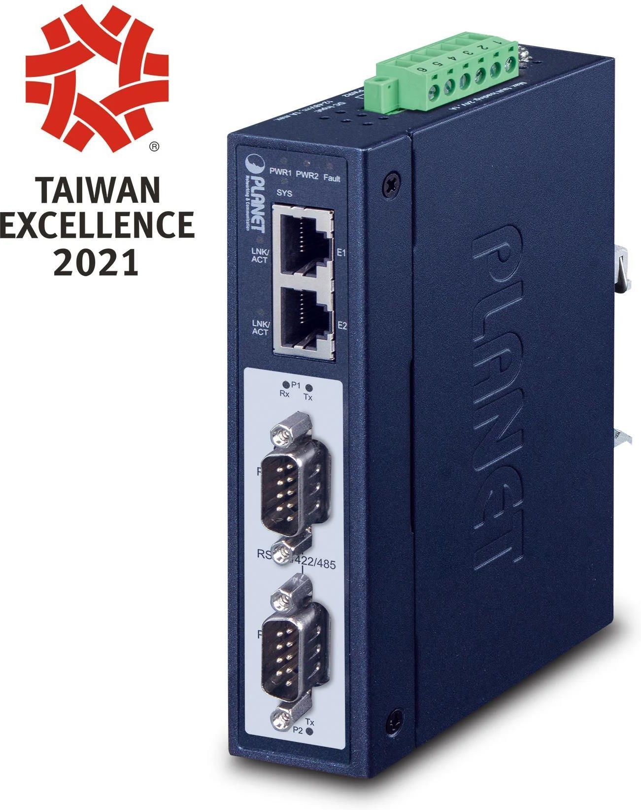 Planet IP30 Industrial 2-Port RS232/RS422/RS485 Modbus Gateway (2 x 10/100BASE-TX, -40~75 degrees C, 15KV isolation, dual 12-48V DC,