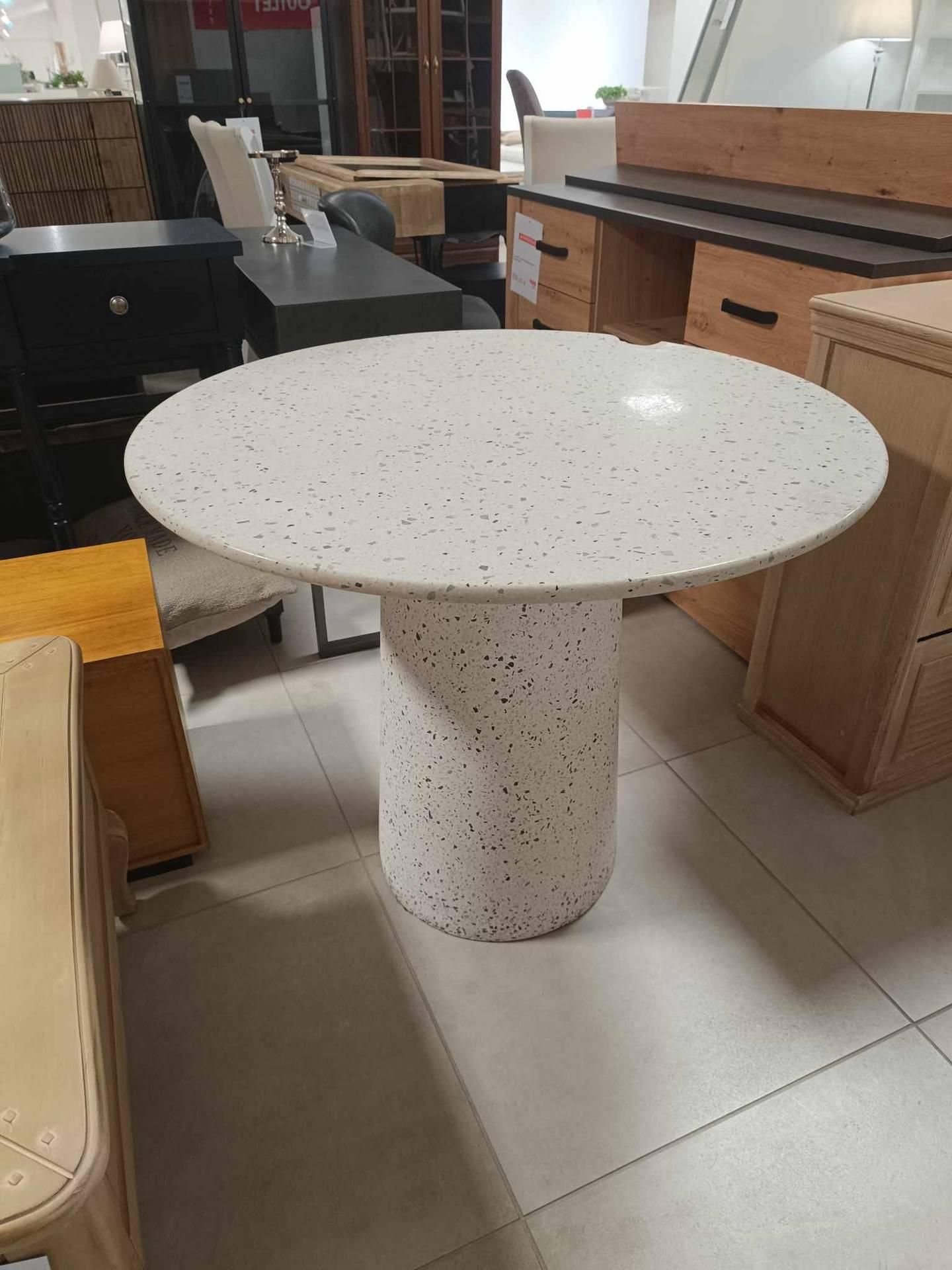 Oryginalny stół wykonany z naturalnego białego kamienia. Posiada uszkodzenie blatu, towar poekspozycyjny.