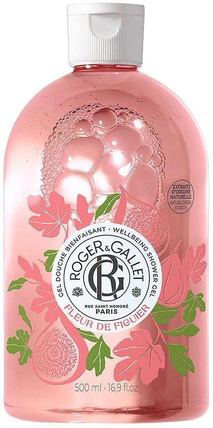Roger&Gallet Fleur de Figuier Wellbeing, żel pod prysznic z ekstraktem z Figi, 500ml Kosmetyk Figa - Piżmo - Grejpfrut Ciepłe akordy miąższu figi orzeźwione zapachem liści drzewa zapewniającego kojący cień i słodko-gorzką nutą grejpfruta. Zapach autorstwa Francisa Kurkdjiana Zapach dojrzałych fig przynosi wspomnienie upalnej sjesty spędzanej w chłodnym cieniu drzew. Żel pod prysznic well-being Fleur de Figuier tworzy kremową pianę, która zachęca do zwolnienia tempa i cieszenia się chwilą. Został wzbogacony o naturalny ekstrakt z figi o właściwościach relaksujących i aloes, a jego składniki myjące są w 100% pochodzenia roślinnego. Jest niezwykle delikatny dla skóry i łatwo się spłukuje. Delikatna i obfita piana pozostawia skórę nawilżoną i rozkosznie pachnącą słonecznymi i owocowymi nutami kwiatu figi zarówno pod prysznicem, jak i podczas kąpieli. Naturalnie relaksujący Żel pod prysznic Fleur de Figuier wzbogacony jest o naturalny ekstrakt z figi, który otula poczuciem spokoju. Remedium na przygnębienie, którego zapach zmniejsza napięcie mięśniowe o 12%.* *Badanie wykonane zostało za pomocą elektromiografii na obszarze nadgarstka.