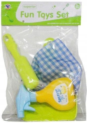 Zestaw do sprzątania zapakowany w przezroczysty worek. W zestawie znajduje się: szufelka, zmiotka, zraszacz oraz szmatka. Zabawka dla dzieci od 3 lat. Podane wymiary są wymiarami produktu w opakowaniu. Wymiary: 283x215 mm Grupa wiekowa: 3+ Opakowanie: blister