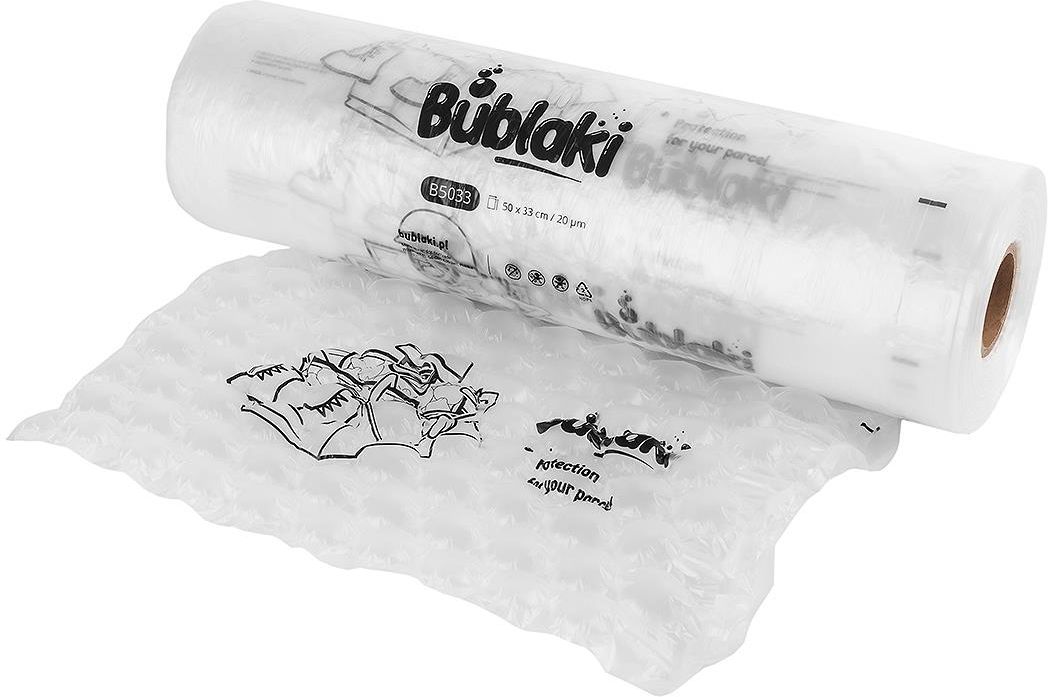 Bublaki 50 x 33 cm to wypełniacze paczek, które gwarantują niezawodną ochronę produktówTowary przed wysyłką należy odpowiednio zabezpieczyć tak, aby podczas transportu nie uległy nawet najmniejszym uszkodzeniom. Dobrze przygotowana paczka w oczach klienta świadczy o naszym profesjonalnym podejściu. Maty powietrzne Bublaki to świetny, funkcjonalny system wypełnień, zapewniający ochronę zawartościom przesyłek nawet w trudnych warunkach. Niezawodna ochrona transportowanych przedmiotówMaty powietrzne Bublaki B5033 zabezpieczają towary poprzez ich owinięcie oraz dodatkowo wypełniają puste przestrzenie pozostające w paczce, co sprawia, że zawartość nie przemieszcza się podczas transportu. Dzięki swojej wytrzymałości i prostej konstrukcji gwarantują niezawodną ochronę produktów zarówno tych lekkich, jak i średnio ciężkich. Można nimi wypełnić różnorodne towary - począwszy od leków, kosmetyków, przez produkty podatne na uszkodzenia, np. szkło, aż po elektronikę. Zabezpieczają niezależnie od temperatury oraz poziomu wilgotności. Odporność mat na obciążenie przekłada się na doskonałą amortyzację - redukują do minimum wstrząsy, uderzenia, a nawet hałasy. Podział na mniejsze komory powietrzne typu "Bubble" (bąble - (3,5 cm średnica pojedynczego bąbla)) sprawia , że mata jest jeszcze bardziej elastyczna, co pozwala na dokładne owinięcie i dopasowanie się do przedmiotu, który chronią.Ogranicz koszty transportu i magazynowaniaPowietrzny wypełniacz paczek Bublaki 50x33 cm przed napompowaniem zajmuje bardzo mało miejsca. Pozbawiony powietrza jest płaski, niczym papier, kompaktowy oraz nawinięty na rolkę, co pozwala ograniczyć koszty magazynowania. Wypełniacze powietrzne są produkowane bezpośrednio na stanowisku pakowania w ilości, jaka obecnie jest potrzebna. Maszyna do produkcji Bublaków jest kompaktowa i może być zainstalowana bezpośrednio przy strefie pakowacza. Wypełniacze powietrzne nie wpływają na wagę przesyłki, gdyż składają się z około 95% z powietrza i tylko 5% z folii. Jest to najlżejszy wypełniacz do kartonów dostępny na rynku.Więcej zadowolonych klientów z BublakamiMaty powietrzne są idealnym środkiem dla każdego przedsiębiorcy, który ceni wygodę, oszczędność, jakość oraz wizerunek. Bublaki to wypełniacz paczek do owijania narażonych przedmiotów w trakcie transportu, cieszący się uznaniem nawet najbardziej wymagających konsumentów, zwłaszcza tych, którzy stawiają na rozwiązania ekologiczne. Stosując wypełniacze powietrzne, skutecznie zredukujesz ilość reklamacji, zwiększając tym sposobem satysfakcję wśród klientów. Odpowiednio przygotowane i zabezpieczone paczki z wykorzystaniem wytrzymałych wypełniaczy świadczą o naszym profesjonalizmie, co pozytywnie wpłynie na wizerunek firmy. Ekologiczne wypełniacze do paczekNie istnieje bardziej ekologiczne rozwiązanie niż zastosowanie wypełniaczy z powietrzem. Bublaki B5033 mogą zostać ponownie użyte bądź poddane recyklingowi. Dzięki temu uznaje się je za wariant nie tylko ekonomiczny, ale również ekologiczny. Szybkość i łatwość pakowaniaProdukt po wypełnieniu powietrzem, od razu jest gotowy do użycia. Do napompowania ich wykorzystuje się jedną z dedykowanych maszyn do produkcji wypełniaczy powietrznych. Są łatwe w użyciu - między każdą z mat znajduje się perforacja, która pozwala na łatwe odrywanie ich między sobą. W ten sposób można dobrać odpowiednią ilość do transportowanego przedmiotu i jego opakowania. Maty powietrzne Bublaki B5033 - Najważniejsze cechyWszystko, co musisz wiedzieć o Bublakach Stabilność towaru podczas transportu Wypełniają puste przestrzenie wewnątrz paczki, aby zapakowany produkt nie przemieszczał się w trakcie transportu Prawdziwy bohater w Twojej paczce Zapewniają ochronę i amortyzację owiniętych przedmiotów w trakcie wysyłki Przyjazne dla środowiska Bublaki mogą zostać wielokrotnie wykorzystane, a także podlegają recyklingowi Oszczędność miejsca i kosztów przesyłki Minimalizują koszty transportu i magazynowania. Bublaki przed napompowaniem nie zajmują wiele miejsca, a ich znikoma waga wpływa na obniżenie kosztów wysyłki Wypełnij i zabezpiecz mnóstwo paczek Rolka o długości 300 m pozwoli na zabezpieczenie wielu towarów Wytrzymałe i solidne Grubość folii wynosi 20 mikronów Materiał Maty powietrzne Bublaki zostały wykonane z LLDPE - HDPE Rozmiar Rozmiar pojedynczej maty wynosi 50x33 cm (po napompowaniu jest o około 10% mniejszy)