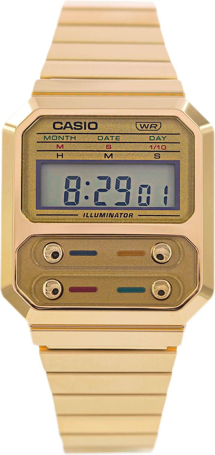 Casio Vintage A100WEG 9AEF Zegarek Casio Vintage A100WEG 9AEF to wyjątkowy model, który łączy w sobie klasyczną estetykę lat 80. z nowoczesnymi funkcjonalnościami, tworząc stylowy dodatek pasujący zarówno do damskiej, jak i męskiej ręki. Jego unikalny design i zaawansowane funkcje sprawiają, że jest to zegarek nie tylko o wyjątkowym wyglądzie, ale także o praktycznym zastosowaniu na co dzień. Design i styl Zegarek cechuje się prostokątną kopertą lakierowaną na złoty kolor oraz stalową bransoletą oksydowaną na złoto, co nadaje mu niepowtarzalnego, retro wyglądu nawiązującego do klasycznych czasomierzy z lat 80. Nowa stylistyka tarczy, inspirowana grami telewizyjnymi z tamtego okresu, dodaje mu charakteru i podkreśla unikalny design. Główne cechy produktu: Producent: Casio Kraj produkcji: Japonia.  mechanizm kwarcowy wodoszczelność do 30m, podświetlenie diodą elektroluminescencyjną, stoper mierzący czas do 60 minut z dokładnością do 1/100 sekundy, alarm dzienny i sygnał pełnej godziny, automatyczny kalendarz dostosowujący datę, żywotność baterii do 7 lat. Specyfikacja techniczna Zegarek posiada kopertę z tworzywa sztucznego oraz bransoletę ze stali nierdzewnej 316L, zapewniając trwałość i wytrzymałość. Szkło hesalitowe chroni przed zarysowaniami, a wymiary koperty to szerokość: 33 mm, grubość: 9 mm, co czyni zegarek eleganckim i dyskretnym dodatkiem. Podsumowanie Zegarek Casio Vintage A100WEG 9AEF to doskonały wybór dla osób ceniących połączenie klasycznej estetyki z nowoczesną funkcjonalnością. Jego unikalny design, zaawansowane funkcje oraz trwała konstrukcja sprawiają, że jest to zegarek, który sprosta oczekiwaniom najbardziej wymagających użytkowników.