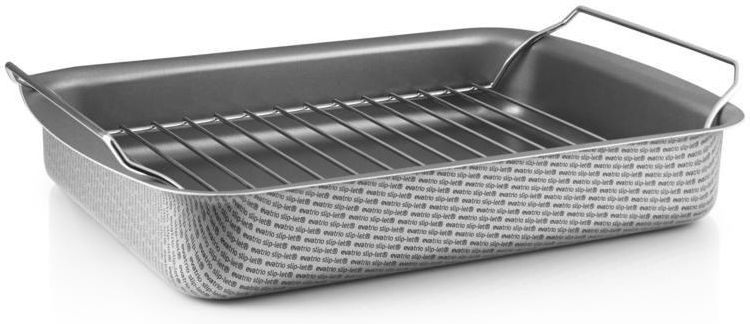 Dania prosto z pieca charakteryzują się chrupiącą skórką i soczystością. Jednak żeby je doprowadzić do pożądanego stanu niezbędne są odpowiednie naczynia. Często niezbędna w takich sytuacjach jest brytfanna. Ta marki Eva Solo jest solidna i jednocześnie lekka. Jej wnętrze zostało pokryte warstwą tworzywa Slip-Let®, która jest nieprzywierające i pozwala smażyć potrawy w małej ilości tłuszczu albo w ogóle bez niego. Brytfanna Eva Solo została wyposażona w ruszt z wygodnymi uchwytami, co jest zwłaszcza poręczne gdy potrawy wymagają różnego czasu na obróbkę. Naczynie można też używać jako blachę do wypiekania ciast. Długość: 35 cm.