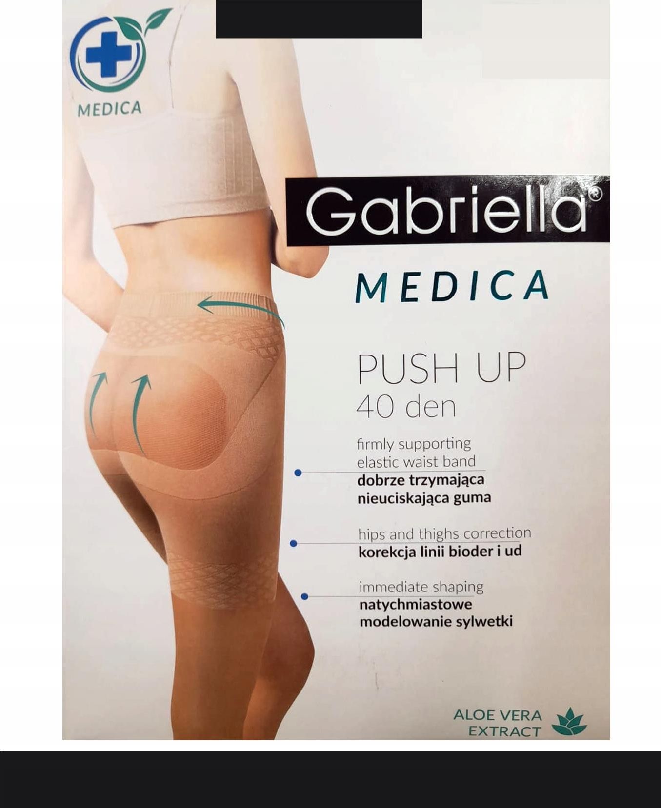 GABRIELLA MEDICA PUSH UP Rajstopy 40 DEN 2-S / Nero Gładkie rajstopy wyszczuplające i korygujące sylwetkę ze specjalną częścią majteczkową uciskającą brzuch i biodra oraz podnoszącą pośladki. Półkryjące, matowe, wykonane z elastycznej przędzy zmiękczonej ekstraktem z aloesu zapewniającej nawilżenie …