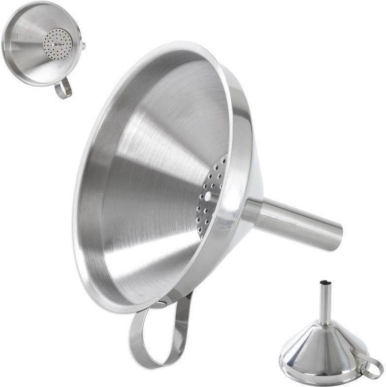 Lejek KUCHENNY z sitkiem filtrem do wina soków Kod produktu: 120430 Najważniejsze informacje PRAKTYCZNY - Lejek kuchenny wyposażony w wyciągane sitko. Znajdzie szerokie zastosowanie w gospodarstwie domowym. Pozwoli nam w wygodny sposób przelać napoje do butelki. Lejek ma wymiary 15 x 12,5 x 10,5 cm. Średnica lejka wynosi 12,5 cm. STALOWY - Wykonany z najwyższej jakości stali nierdzewnej w srebrnym kolorze. Odpowiednio użytkowany posłuży długie lata. FUNKCJONALNY - Wyposażony jest w wyciągane sitko, co pozwoli na odcedzenie przelewanego płynu z drobinek. Lejek nadaje się do mycia w zmywarce do naczyń. UNIWERSALNY - Lejek posiada uniwersalne zastosowanie. Wykorzystamy go do nalewania soków, nalewek, wina, kawy i wielu innych. WYGODNY - Posiada wygodny uchwyt, który stabilnie leży w dłoni i jest poręczny. Lejek można wygodnie zawiesić na relingu kuchennym. Lejek kuchenny z sitkiem i wygodnym uchwytem. Posiada uniwersalne zastosowanie w kuchni. Solidnie wykonany, a zarazem lekki i wygodny w użytkowaniu. Idealny do napełniania butelek. Lejek wyposażony w sitko pozwoli nam odpowiednio przefiltrować przelewany napój. Wykonany z materiałów bezpiecznych dla zdrowia i neutralnych dla żywności. Oryginalny produkt czeskiej marki Orion. Wyprodukowano zgodnie z europejskimi standardami. Materiał: stal nierdzewna Wysokość: 10,5 cm Średnica: 12,5 cm Waga (g): 100 Kolor dominujący: srebrny Długość: 15 cm Szerokość: 12,5 cm