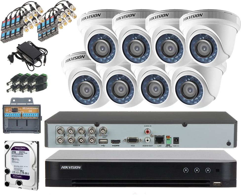 Zestaw monitoringu zawiera: 8x Kamera kopułkowa Hikvision DS-2CE56D0T-IRPF 2 Mpx FullHD 1080p, 1x Rejestrator 8 kanałowy Hikvision IDS-7208HQHI-M1/S, 1x Zasilacz do kamer + rozdzielacz zasilania, 16x Transformator video TR-1D-UHD 1x Dysk do monitoringu (nagrywanie 24/7)- Western Digital Purple 2TB, Komplet złącz i wtyków do wyboru na przewód UTP lub koncentryczny.