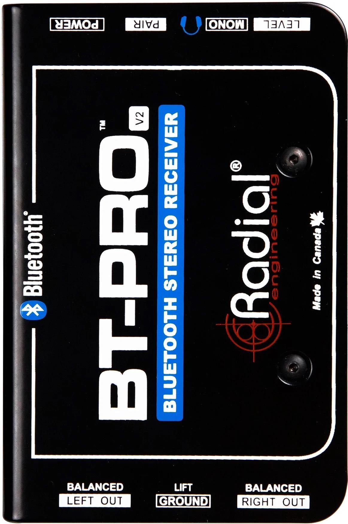 Radial BT-Pro V2 | Aktywny, 2-kanałowy DI-Box z Bluetooth Dwukanałowy, aktywny DI-Box w kompaktowej obudowie. Seria PRO to standard w branży koncertowej na całym świecie.Wbudowany moduł Bluetooth o zasięgu do 30m oraz możliwość nadania mu unikalnego numeru identyfikacyjnego powoduje iż wiele BT-Prov2 może pracować w jednym miejscu przetwarzając strumień danych na wysokiej jakości stereofoniczny sygnał analogowy. Dzięki symetrycznym wyjściom XLR, możliwością zasilania za pomocą Phantom +48V oraz funkcji odłączania masy możemy bezpiecznie dystrybuować sygnał na duże odległości bez jego degradacji oraz zakłóceń w profesjonalnych systemach elektroakustycznych. Dodatkowo wyposażony jest w regulację poziomu wyjściowego, wyjście słuchawkowe oraz funkcję monofonizacji sygnału. Specifications Audio circuit type: Active audio line driver Frequency response: 20Hz to 20KHz Dynamic range: 90dB Total harmonic distortion: 0.05% Output Impedance: 150Ω Signal to Noise: 90dB Bluetooth Compliance: Bluetooth 5.0 Data Compression: SBC and AAC Codecs Features Mono Sum, Ground lift, Level Control, Headphone Input Connectors: Bluetooth 5.0, Device range up to 100' Output Connectors: XLR-M, 3.5mm TRS Headphone Extras: Included power supply General Construction: 14 gauge steel outer shell, molded nylon insert Finish: Durable powder coat Size (L x W x D): 3.3” X 5” X 2” (84 x 127 x 51mm) Weight: 1.1lbs (500g) Power: USB-C connector (Power Only) or 48V Phantom Conditions: For use in dry locations only between 5°C and 40°C Warranty: Radial 3-year, transferable