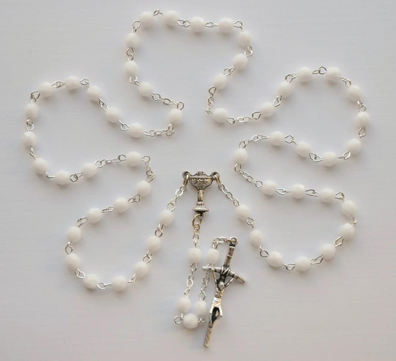 Różaniec komunijny Koralik w kształcie kryształka Kolor koralika: biały Długość koralika 5 mm