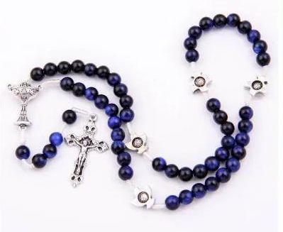 Różaniec Komunijny Na Sznurku Tygrysie Oko Niebieskie Wielkość koralika: 6 mm Długość różańca z krzyżykiem: 31 cm Długość różańca do łącznika: 19 cm