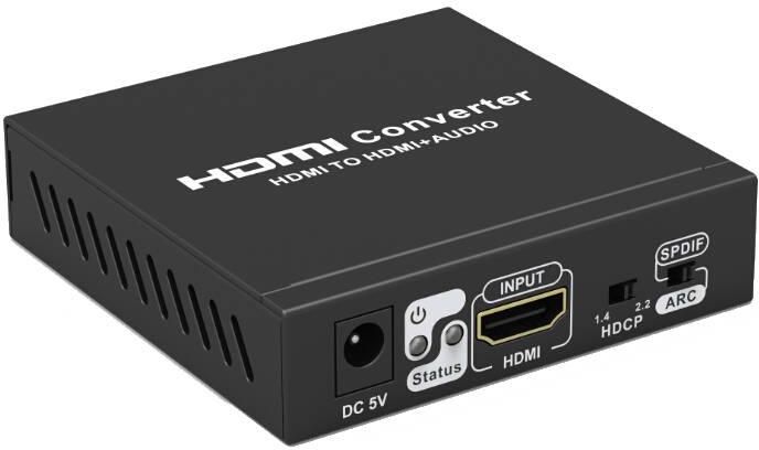 Przedmiotem sprzedaży jest: HDCEXTR5; Extractor HDMI-Audio SPDIF R/L ARC SPH-AE05. Extractor HDMI-Audio SPDIF R/L ARC SPH-AE05 Extractor HDMI na HDMI Audio SPDIF R/L ARC SPH-AE05Extractor HDMI na HDMI + Audio (R/L+SPDIF) pozwala na podłączenie urządzenia wysyłającego sygnał audio i video (tuner, konsola, dvd, blu-ray) do telewizora kablem HDMI. Dodatkowo można wyodrębnić sygnał audio z urządzenia i przesłać go do amplitunera kina domowego lub innego tego typu urządzenia. Najważniejsze cechy extractora SPH-AE05 1 kanałowy sygnał wejściowy HDMI jest konwertowany na 1 kanałowy sygnał audio HDMI + dźwięk SPDIF + dźwięk koncentryczny + dźwięk stereo R / L (dźwięk SPDIF i dźwięk koncentryczny nie może być jednocześnie emitowany, gdy używana jest funkcja ARC, wyjście stereo R / L nie jest dostępne) Obsługa standardu HDMI0, HDCP2, zgodnego z HDCP1.4 Obsługa wzajemnej konwersji HDCP1.4 i HDCP2.2 Obsługa formatu wideo 3D Wsparcie ARC Obsługa HDR Obsługa rozdzielczości 4Kx2K @ 60Hz Obsługa YUV4: 2: 0/4: 2: 2/4: 4: 4 i RGB 4: 4: 4 Bezstratna transmisja Plug and play, łatwy w instalacji Przykładowy schemat podłączenia extractora audio Specyfikacja