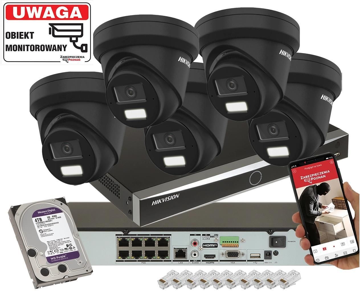 Zestaw monitoringu zawiera: 5x Kamera IP Hikvision DS-2CD2363G2-LI2U(BLACK) ColorVu 4Mpx, 1x Rejestrator IP Hikvision DS-7608NXI-K2/8P Acusense na 8 kamer do 8MPx, 1x Dysk do monitoringu WD 4TB HDD-WD42PURU, 10x wtyk RJ-45 1x Tablica informacyjna
