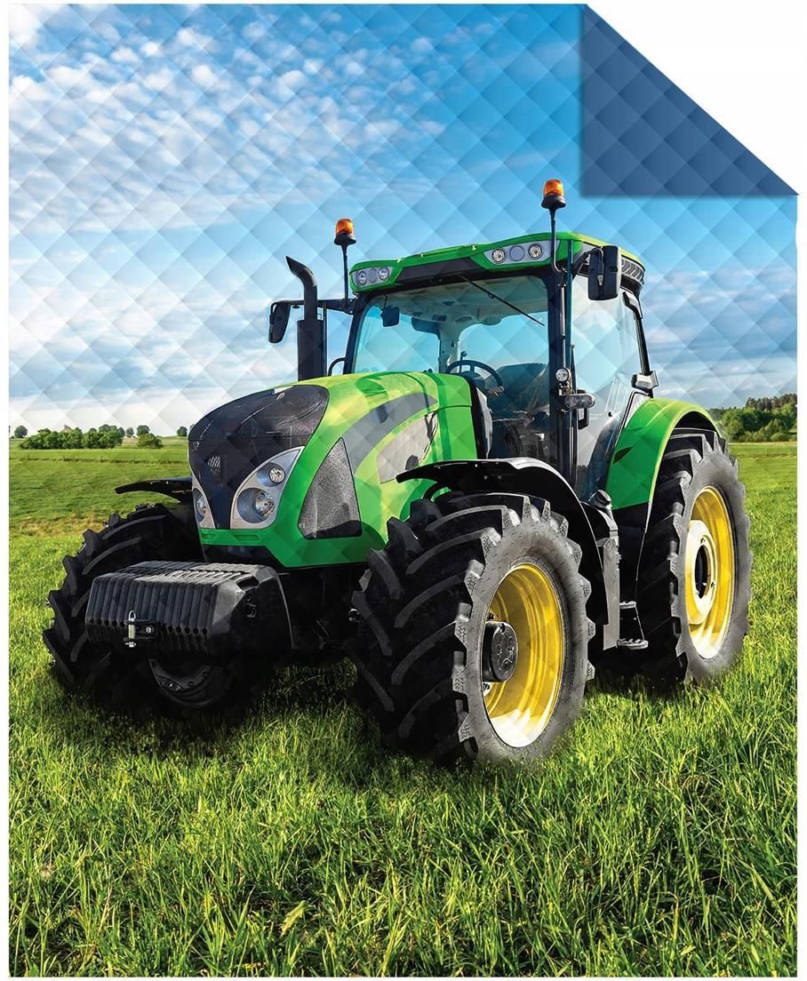 Designerska narzuta na łóżko 170 x 210 pikowana do pokoju dziecięcego wzór traktor Parametry 100% poliester rozmiar 170 x 210 cm wypełnienie poliester nowa oryginalnie zapakowana w walizkę z zamkiem idealny pomysł na nietuzinkowy prezent narzuta jest pikowana dwustronna tzn z jednej strony grafika …