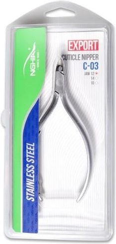 Profesjonalne cążki do skórek NGHIA EXPORT C-03 (rozmiar 12) Profesjonalne cążki do skórek ze stali nierdzewnej chirurgicznej z jednostronną sprężyną, przeznaczone do precyzyjnego wycinania skórek. Dostępne w rozmiarach szczęk 12 (5 mm), 14 (6 mm), 16 (7 mm). Dzięki metodzie łączenia szczęk Lap …