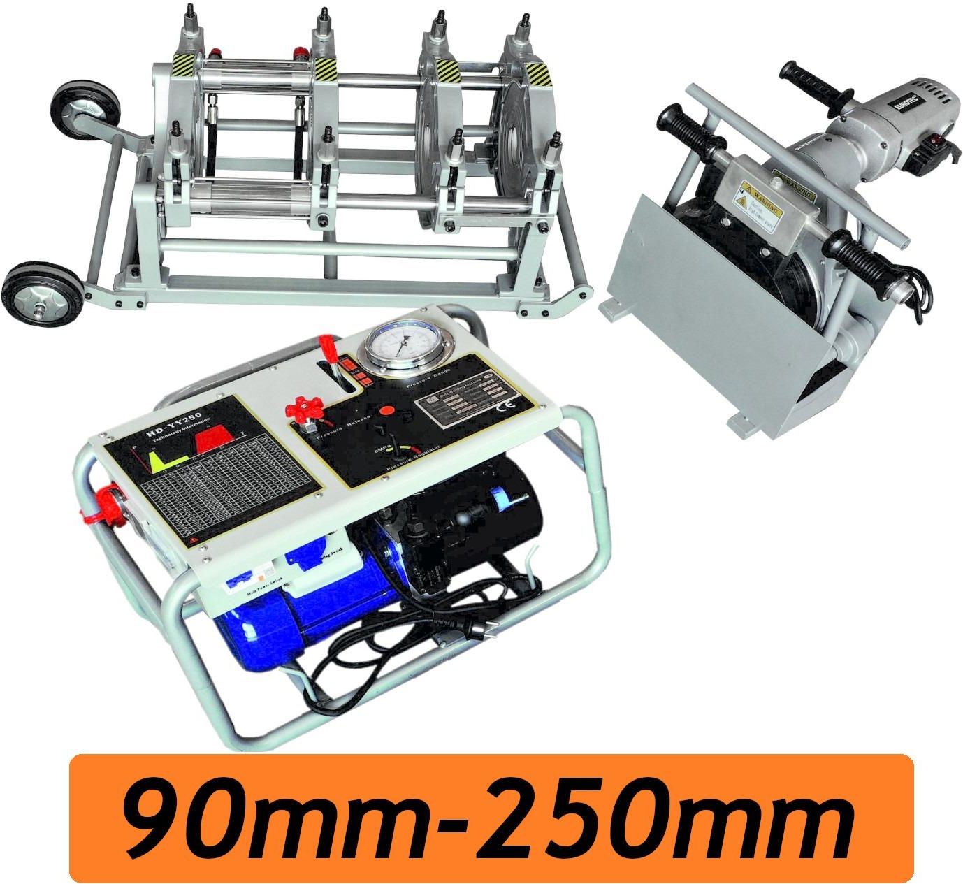 Zgrzewarka doczołowa hydrauliczna HD-YY 250 z dociskiem hydraulicznym o zakresie zgrzewanych średnic 90 - 250 mm. Zestaw zawiera: – sanki z możliwością zamontowania kółek transportowych, wyposażone w dwa siłowniki hydrauliczne, 2 zaciski stałe, 2 regulowane w zależności od preferencji ustawienia …