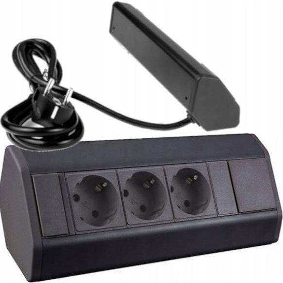 GNIAZDO MEBLOWE BIURKOWE 3x230V CORNER BOX CZARNY DESIGN CORNERBOX-CZ-3DE CORNER BOX wersja schuko. CORNER BOX - to przedłużacz narożny umożliwiający ładowanie kilku urządzeń jednocześnie. Doskonałe rozwiązanie do biur, mieszkań, garaży i wszędzie tam, gdzie pojawia się potrzeba zasilania dużej liczby urządzeń. Idealny do montażu w narożniku mebli biurkowych i kuchennych, w narożnikach ścian oraz na powierzchniach płaskich. Można go zamontować w pionie, jak i w poziomie. Wbudowane 3x gniazda SCHUKO 16A 230 V AC. Doskonałe rozwiązanie do biur, mieszkań, garaży. Parametry Napięcie: 230V AC; Gniazda: 3x SCHUKO; Moc: max 3600W; Stopień ochronności: IP20; Wymiary (mm): 224x100; Długość przewodu: 1,8 m zakończony wtyczką euro; Kolor: czarny; Zastosowanie wewnętrzne w suchym pomieszczeniu. Szybki i prosty montaż Najlepszym oraz najszybszym rozwiązaniem jest zamocowanie przedłużacza w wybranym miejscu za pomocą taśmy dwustronnej. Dwa odcinki przyklejone na ścianach listwy umożliwią przymocowanie w potrzebne miejsce. Innym rozwiązaniem jest zamontowanie na stałe za pomocą wkrętów. Zastosowanie Gniazda blatowe stanowią aktualnie standard instalacji elektrycznych i teletechnicznych w nowoczesnych miejscach pracy i przestrzeni domowej. Zastosowanie ich umożliwia prosty i szybki dostęp do mediów a przy tym możliwe jest zachowanie porządku związanego z odwiecznym problemem nadmiaru okablowania. Jest to praktyczne i estetyczne rozwiązanie dedykowane do wszystkich nowoczesnych domów, biur oraz sal konferencyjnych. ZDJĘCIA PRODUKTÓW
