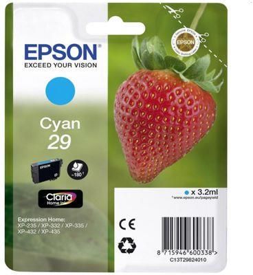 Atrament 29 Truskawka Claria Home, pojedyncze opakowanie, Cyan Atrament 29 Truskawka Claria Home idealnie nadaje się do niedrogiego i niezawodnego drukowania bez kompromisów. Dostępne w rozmiarach standardowych i XL oraz w opakowaniach pojedynczych i zbiorczych Multipack, co pozwala na elastyczne zastąpienie tylko takiego koloru, jakiego potrzebujesz. Oszczędzaj atrament stosując pojedyncze wkłady atramentowe Epson Atramenty mają bardzo atrakcyjną cenę, a dzięki oddzielnym wkładom możesz wymienić tylko zużyty kolor. Dzięki większym pojemnikom z tuszem w rozmiarze XL możesz wydrukować do 470 stron w czerni i do 450 stron w kolorze. Atramenty Epson są zoptymalizowane do współpracy z drukarkami Epson Atramenty i papier firmy Epson zostały opracowane tak, aby w użyciu z drukarkami Epson dawać za każdym razem najlepsze rezultaty. Kompatybilny z drukarkami Expression Home XP-235, Expression Home XP-332, Expression Home XP-335, Expression Home XP-432, Expression Home XP-435 POZOSTAŁE KOLORY Z TEJ SERII: