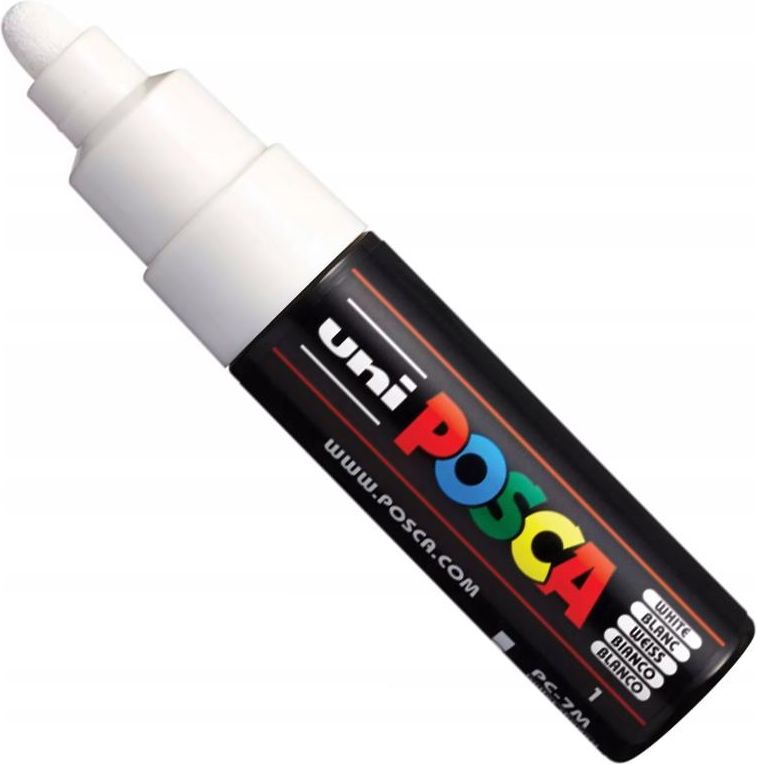 Marker z farbą plakatową Uni POSCA PC-7M biały X23021 * nadają się do pisania po różnych materiałach tj: szkło, metal, drewno, plastik, tkanina, porcelana, terakota, papier, drewno, można nimi pisać także po ciele * farba łatwa do usunięcia wodą z mydłem * produkt ten skierowany jest przede wszystkim do: artystów, graficiarzy, studentów, uczniów oraz dzieci w każdym wieku * doskonale nadaje się do zastosowań profesjonalnych, odpowiedni dla miłośników rękodzieła, a zwłaszcza scrapbookingu i tworzenia kartek okolicznościowych oraz artystów, którzy wykorzystują go do wykonywania wykończeń, detali i konturów * dzięki markerom POSCA można samodzielnie zaprojektować koszulkę czy czapkę z daszkiem - wystarczy zaprasować materiał i wymyślony wzór będzie trwały * produkt wykorzystywany może być także do ozdoby szyb sklepowych, sprzętu muzycznego, sportowego czy nawet auta * jak utrwalić kolor? - szkło, plastik, metal, drewno, papier, terakota - przemalowanie bezbarwnym lakierem - ceramika - wypalić w piekarniku, w temperaturze około 180°C - tkanina - zaprasować żelazkiem, bez pary wodnej na drugiej stronie * produkt nietoksyczny * różne kolory po wyschnięciu tuszu nie łączą się * odporny na działania światła i warunków atmosferycznych * unikalny tusz pigmentowy na bazie wody * kolory tuszu: biały (symbol: UNPC7M/BI), brązowy (symbol: UNPC7M/BR), czarny (symbol: UNPC7M/CA), czerwony (symbol: UNPC7M/CE), żółty ciemny (symbol: UNPC7M/CZO), fioletowy (symbol: UNPC7M/FI), niebieski jasny (symbol: UNPC7M/JNI), pomarańczowy jasny (symbol: UNPC7M/JPO), zielony jasny (symbol: UNPC7M/JZI), niebieski (symbol: UNPC7M/NI), pomarańczowy (symbol: UNPC7M/PO), różowy (symbol: UNPC7M/RO), szary (symbol: UNPC7M/SZ), zielony (symbol: UNPC7M/ZI), żółty (symbol: UNPC7M/ZO) * jednostka sprzedaży 1 sztuka * UNI to marka długopisów i ołówków produkowanych przez japońską firmę MITSUBISHI PENCIL COMPANY LIMITED - marka została wprowadzona w 1979 roku jako model pióra kulkowego, a następnie rozszerzyła się na pozostałe produkty MITSUBISHI PENCIL - produkty UNI charakteryzują się dużą dokładnością i starannością wykonania Symbol dostawcy: UNPC7M/BI