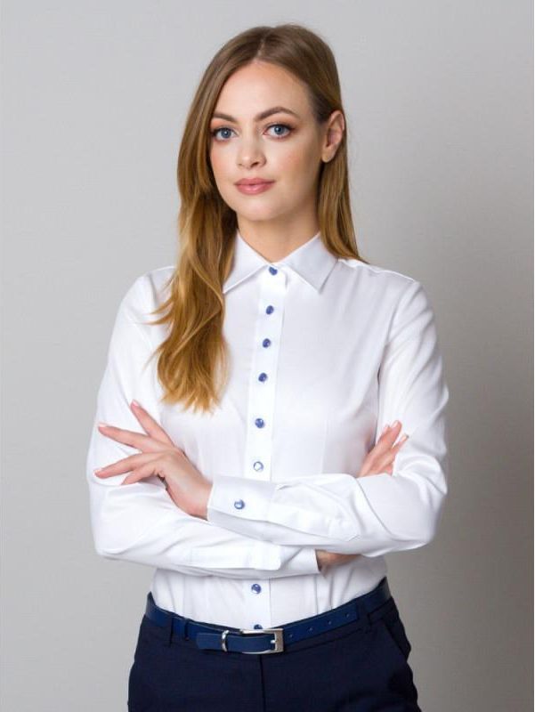 Biała koszula damska o gładkiej fakturze z klasycznym kołnierzykiem i błękitnymi perłowymi guzikami