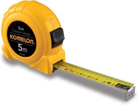 Miara 5m zwijana Komelon [PEN59], Eco: stalowa miara o długości 5 m, taśma miernicza o dużej trwałości z wyraźnym, dobrze czytelnym oznakowaniem, mechanizm wewnętrzny superior zapewnia lepsze, bezawaryjne działanie, miara wyposażona w doskonały system blokowania, który dobrze trzyma ostrze, szerokość i dobre wyprofilowanie taśmy mierniczej umożliwia pomiar bez konieczności podparcia do 1,8m, zaczep mierniczy umocowany dwoma nitami, co umożliwia dokładny pomiar wewnętrzny i zewnętrzny, ergonomiczna obudowa zapewnia dobry chwyt. Parametry techniczne miaryKOMELON PEN59: długość taśmy: 5m, szerokość taśmy: 19mm, automatyczne zwijanie: tak, blokada: tak, długość pomiaru bez podparcia: 1,8m żółta taśma z podziałką co 1mm, taśma miernicza stalowa pokryta nylonem, klasa dokładności: II (±1,3mm) Taśma miernicza wysokiej jakości. Na początku taśmy nadrukowane są: długość znamionowa, klasa dokładności, CE - znak dopuszczający do obrotu w Europie, rok produkcji, temperatura odniesienia, marka/producent.