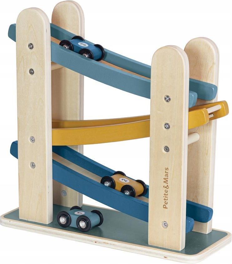 PETITE&MARS Drewniana zabawka zjeżdżalnia tor Milky Way Wood of Mars 18m+ Kolekcja drewnianych zabawek WOOD OF MARS to coś więcej niż tylko zestawy klocków. To wyjątkowy świat, gdzie rozwija się wyobraźnia, motoryka i kreatywność dzieci. Te zabawki nie z tej ziemi zachęcają do odkrywania nowych wymiarów zabawy, gdzie każdy element stymuluje rozwój i umiejętność przestrzennego myślenia. Każdy element kolekcji jest starannie zaprojektowany, aby nie tylko fascynować estetycznie, ale także rozwijać zdolności kognitywne dzieci. To niepowtarzalne połączenie edukacji i estetyki, które pozwala dzieciom na twórcze eksplorowanie kosmicznych tajemnic i rozwijanie niezwykłych umiejętności. Drewniana zjeżdżalnia dla samochodzików MILKY WAY to wielopoziomowa przygoda dla małych fanów wyścigów. Zestaw składa się z 3 poziomów i 3 małych samochodzików, które można puszczać z góry na dół, zapewniając atrakcyjną zabawę. Samochodziki mogą także służyć do samodzielnych wyścigów a minimalistyczny design zjeżdżalni w delikatnych, stonowanych barwach, idealnie wpasowuje się w dziecięcy pokój. Ta zabawka może służyć nie tylko do zabawy, ale także do nauki liczenia, rozwijając jednocześnie motorykę i koordynację ręka-oko dziecka. Jest świetnym uzupełnieniem dziecięcego pokoju, ponieważ nie tylko zapewnia rozrywkę, ale także rozwija szereg umiejętności, takich jak zdolności manualne, zręczność, wyobraźnię czy kreatywność. Cechy • trwała i solidna, • wykonana z drewna herbacianego i sklejki, • ergonomiczna konstrukcja, wykonana z myślą o najmłodszych, • wspomaga rozwój motoryki małej dziecka, • ćwiczy zręczność, • nauka kolorów, • nauka liczenia, • przeznaczona dla dzieci od 18 miesiąca życia (18m+), • wymiary zabawki: 30 x 14 x 25 cm.