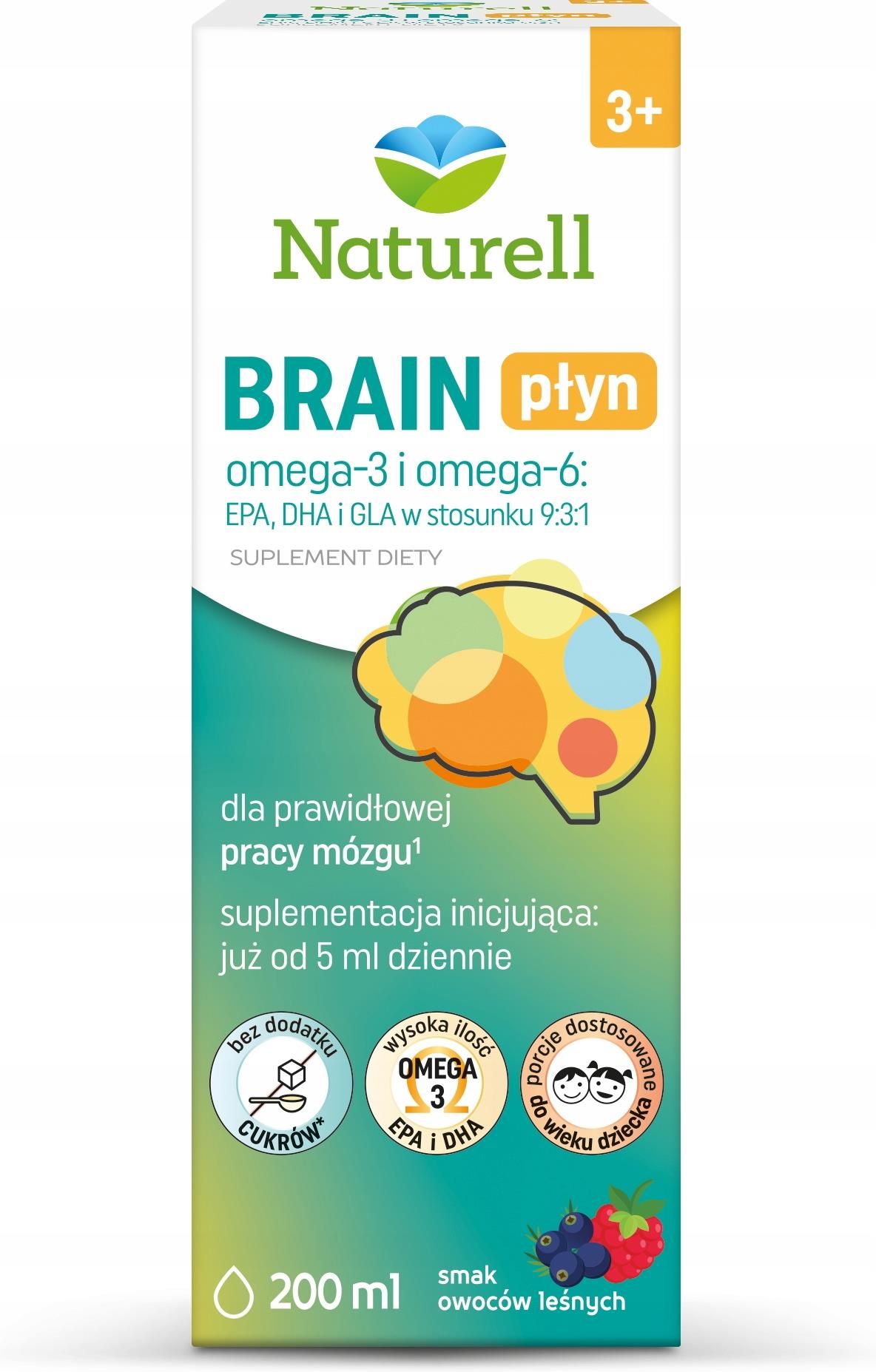 Usp Zdrowie Naturell Brain Płyn 3+ Smak Owoce Leśne 200 ml Naturell Brain płyn o smaku owoców leśnych to innowacyjny suplement diety wspierający prawidłowe funkcjonowanie mózgu. Produkt zawiera starannie dobrane składniki, które korzystnie wpływają na funkcje poznawcze i prawidłowe działanie układu nerwowego. Naturell Brain płyn 200 ml to doskonały wybór dla osób pragnących zadbać o lepszą sprawność umysłową w codziennym życiu. Stanowi również wsparcie dla dzieci. Ten płyn na pamięć i koncentrację sprzyja efektywnej nauce, pomagając dzieciom lepiej przyswajać wiedzę. Brain płyn jest odpowiedni dla dzieci powyżej 3. roku życia i osób dorosłych. Naturell Brain płyn zawiera wysoka ilość kwasów Omega-3: eikozapentaenowego (EPA) i dokozaheksaenowego (DHA) w połączeniu z kwasem Omega-6: gamma-linolenowym (GLA) w stosunku ilościowym odpowiednio 9:3:1. Źródłem kwasów Omega-3 w produkcie Naturell Brain płyn jest wysokiej jakości olej z mikroalg Schizochytrium sp. dostarczający DHA oraz olej z ryb (sardeli) zawierający DHA i EPA. GLA (kwas Omega-6) pochodzi z oleju z nasion czarnej porzeczki. Kwas dokozaheksaenowy (DHA) przyczynia się do utrzymania prawidłowego funkcjonowania mózgu (korzystne działanie występuje w przypadku spożywania 250mg DHA dziennie). Składniki olej rzepakowy, olej rybny (przeciwutleniacz: mieszanina tokoferoli) zawierający kwas eikozapentaenowy (EPA) i kwas dokozaheksaenowy (DHA), olej z nasion czarnej porzeczki (Ribes nigrum) zawierający kwas gamma-linolenowy (GLA), olej z mikroalg Schizochytrium sp. (przeciwutleniacze: mieszanina tokoferoli, estry kwasów tłuszczowych i kwasu askorbinowego) zawierający kwas dokozaheksaenowy (DHA), witamina E (D-alfa-tokoferol), naturalne aromaty. 3,33ml płynu zawiera: EPA 264mg, DHA 88mg, GLA 29,3mg, witamina E 8mg (67%)*. 5ml płynu zawiera: EPA 396mg, DHA 132mg, GLA 44mg, witamina E 12mg (100%)*. 6,67ml płynu zawiera: EPA 528mg, DHA 176mg, GLA 58,6mg, witamina E 16mg (133%)*. 8,33ml płynu zawiera: EPA 660mg, DHA 220mg, GLA 73,3mg, witamina E 20mg (167%)*. *RWS - Referencyjna wartość spożycia Zalecane spożycie Dzieci 3-5 lat: suplementacja inicjująca (przez pierwsze 3 miesiące stosowania): 5ml.  Dzieci 6-7 lat: suplementacja inicjująca (przez pierwsze 3 miesiące stosowania): 6,67ml. Dzieci od 8 roku życia i dorośli: suplementacja inicjująca (przez pierwsze 3 miesiące stosowania): 8,33ml. Suplementacja podtrzymująca (po 3 miesiącach od rozpoczęcia stosowania): bez względu na wiek: 3,33ml lub 5ml. Opakowanie 200ml Suplementy diety nie mogą być stosowane jako substytut (zamiennik) zróżnicowanej diety ani zdrowego trybu życia. Nie należy przekraczać zalecanej porcji produktu do spożycia w ciągu dnia. Suplementy diety powinny być przechowywane w sposób niedostępny dla małych dzieci. Przed zastosowaniem produktu sugerujemy zapoznanie się z dokładnymi informacjami podanymi na opakowaniu lub załączonej ulotce.