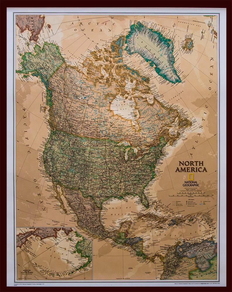 Mapy wydawnictwa National Geographic cechuje niezwykła dbałość o szczegóły połączona z odpowiednio dobraną kolorystyką, co dodaje mapie klasy na najwyższym poziomie. Mapa polityczna Ameryki Północnej w skali 1:14 009 000 zawiera m.in.:- granice państw,- nazwy większych miasta,- wody powierzchniowe,- zaznaczone międzynarodowe lotniska.Dodatkowo:Mapa oprawiona jest w elegancką ramkę aluminiową, naniesiona na podkład magnetyczny, dzięki czemu można oznaczać interesujące punkty przy użyciu magnesów.Mapy National Geographic serii Executive cechuje najwyższy światowy poziom edytorski i merytoryczny, niezwykła dbałość o szczegóły połączona z oryginalną kolorystyką tworzy piękny obraz. Subtelne kawowo-złote odcienie przeplatane z pastelowymi kolorami upiększą twoje biuro lub pokój.