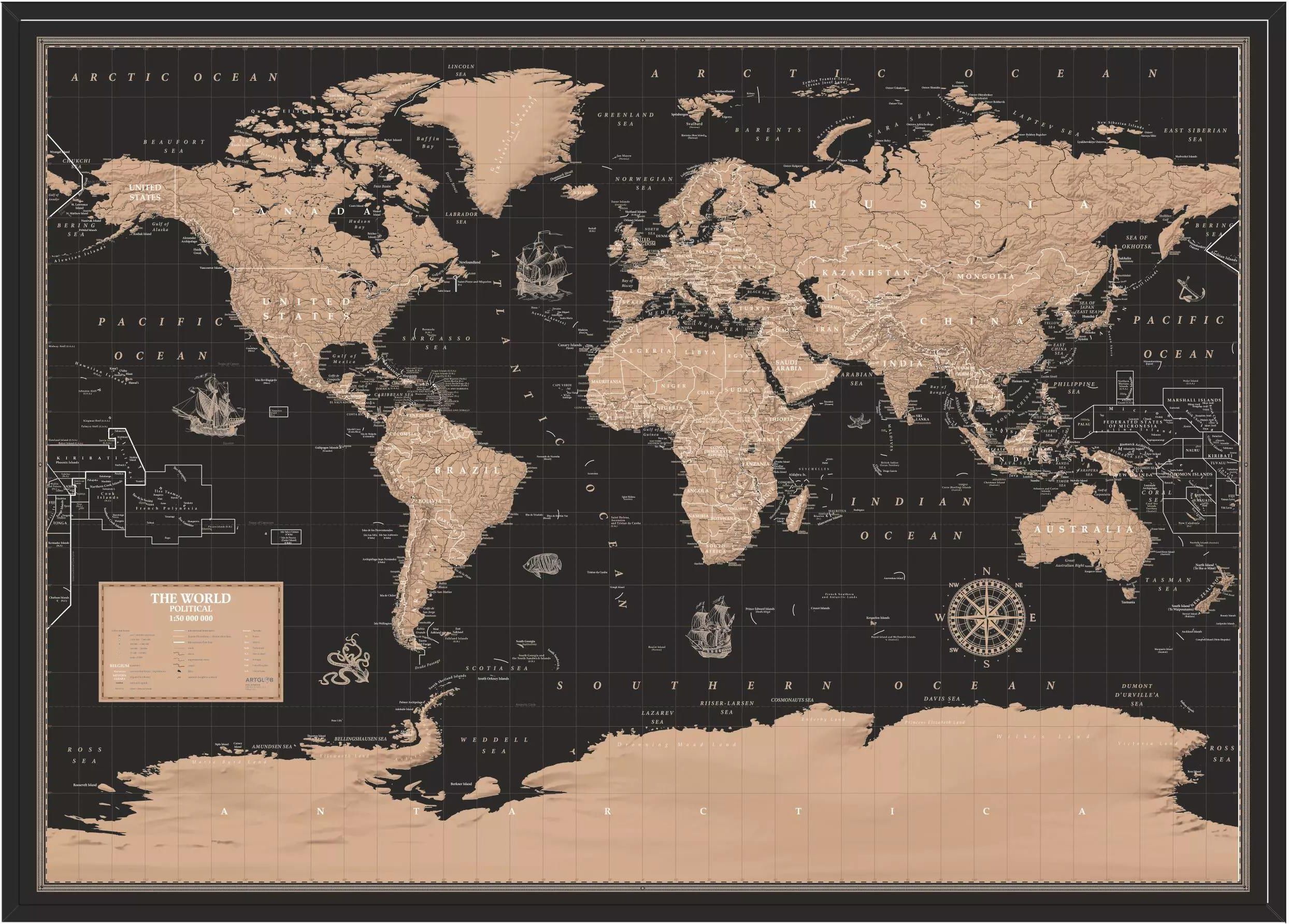 World Black - polityczna mapa świata w skali 1:30 000 000 wydawnictwa ArtGlob, jest jedną z najładniejszych map dostępnych na rynku.Dzięki swej wysokiej jakości może być doskonałą ozdobą zarówno domu, biura, jak również, nieprzeciętnym pomysłem na idealny prezent.Na mapie znajdziemy m.in. podział polityczny świata, miejscowości i aglomeracje miejskie, terytoria zależne, wyraźnie zaznaczone stolice, granice państw i terytoriów zależnych, główne drogi, największe rzeki, jeziora, szczyty. Mapa oprawiona jest w elegancką ramkę drewnianą, naniesiona na podkład w który można wbijać znaczniki, oznaczając w ten sposób interesujące punkty. Jeżeli jesteś zainteresowany innego rodzaju oprawą mapy, napisz do nas. Zrealizujemy dla Ciebie zamówienie indywidualne.Mapa w języku angielskim!