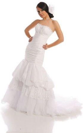 Fason: rybka, tren Dekolt przód: odkryte ramiona Plecy: odkryte częściowo Zapięcie: suwak kryty z tyłu Ozdoby: kamienie, koraliki, cekiny, draperia Materiał: tafta, satyna, organza, koronka