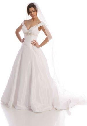 Fason: princessa, tren Dekolt przód: szpic Plecy: dekolt szpic Zapięcie: suwak zwykły z tyłu Ozdoby: haftowana aplikacja, kamienie, koraliki, cekiny Materiał: tafta, tiul