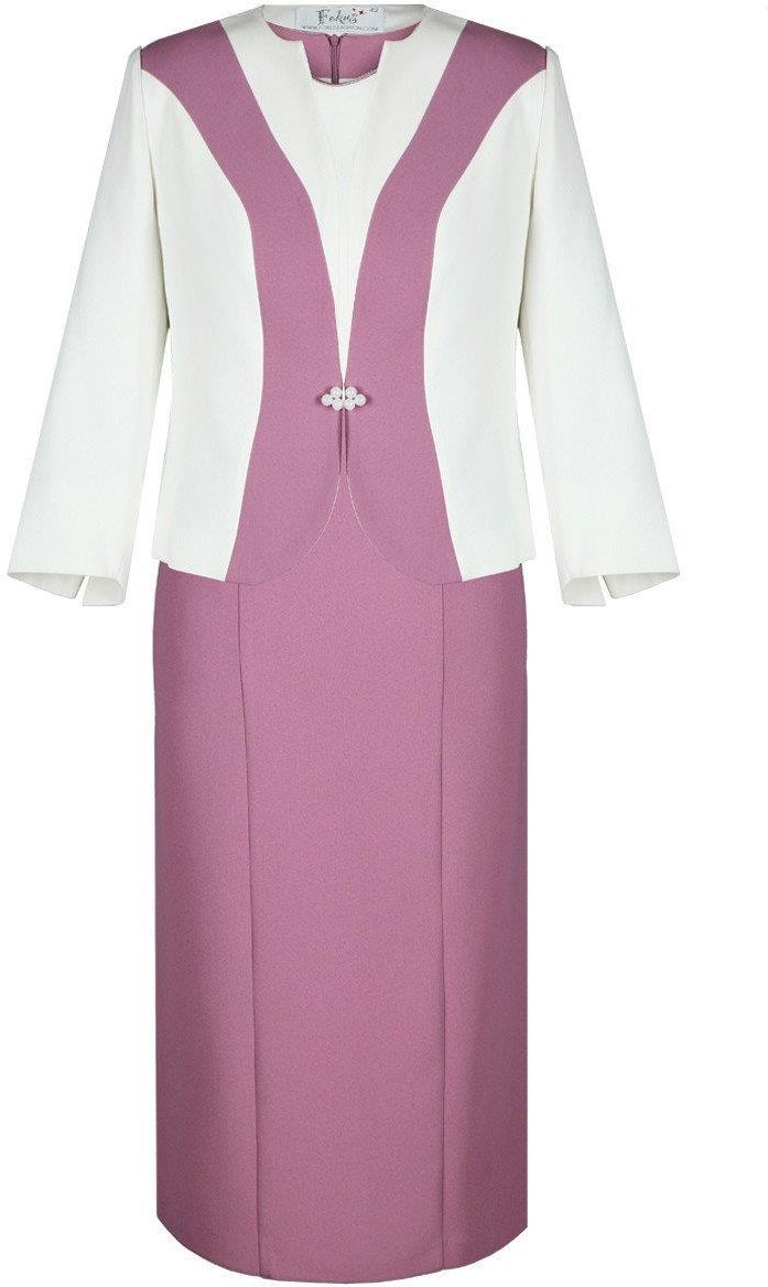 Sukienka: midi, prosta, odcięta w pasie dekolt półokrągły rękaw krótki suwak kryty z tyłu rozporek z tyłu tkanina elast - krepa, podszewka Żakiet: kontrast. wstawki zapięcie guzik, perełki rękaw 3/4 tkanina elastyczna - krepa, podszewka
