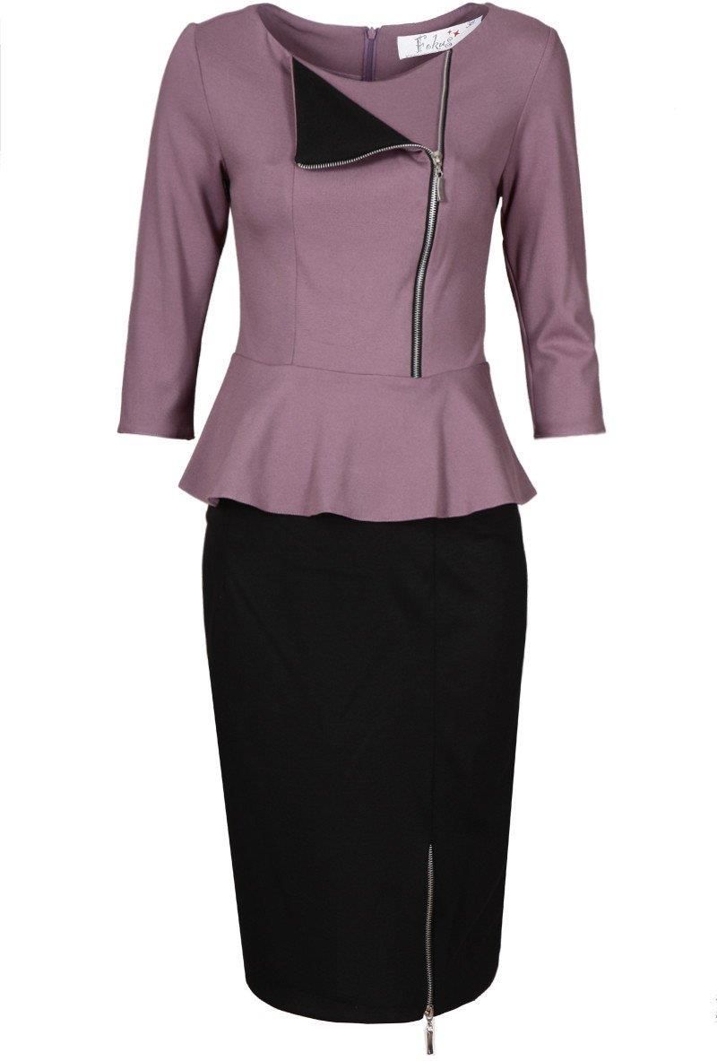 Spódnica: midi, prosta suwak kryty z tyłu pęknięcie z przodu metalowy suwak z przodu dzianina matowa Bluzka: odcięta w pasie, baskinka dekolt okrągły, fantazyjny suwak kryty z tyłu rękaw 3/4 suwak metalowy z przodu dzianina matowa