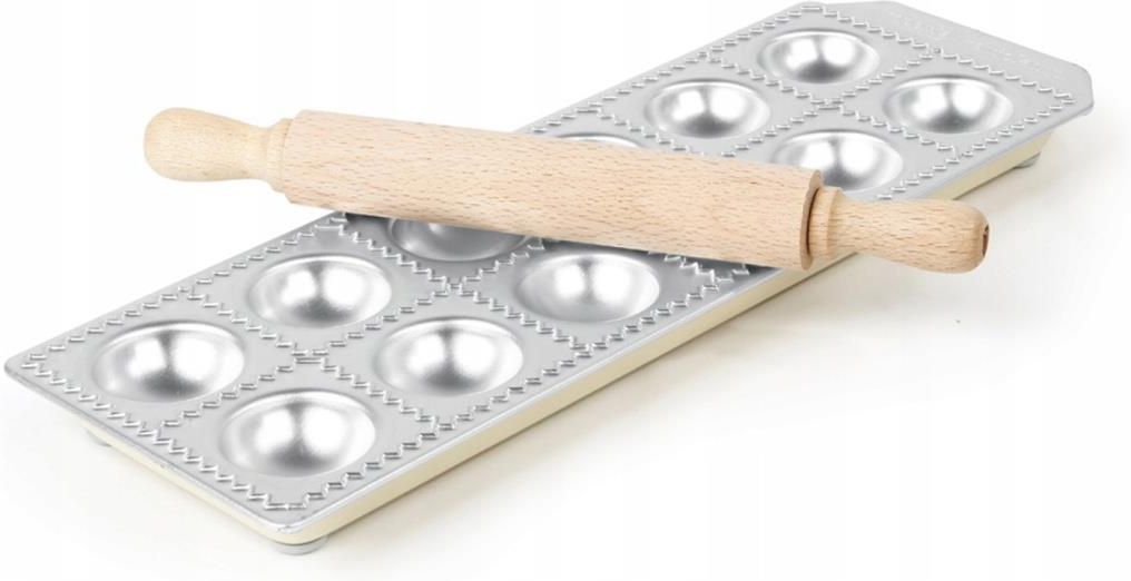 FORMA DO OKRĄGŁYCH RAVIOLI 12szt. + WAŁEK HENDI H975541 Forma do ravioli marki Hendi ułatwi przygotowywanie pysznych włoskich pierożków zarówno w warunkach domowych, jak i w restauracyjnych kuchniach. Formę wykonano z aluminiowego odlewu. Antypoślizgowe nóżki nie rysują blatu, zapewniając jednocześnie stabilność. Forma posiada 12 otworów, ułatwiających nadziewanie ravioli. W zestawie znajduje się drewniany wałek. Specyfikacja Artykuł: Forma do okrągłych ravioli Nr katalogowy: H975541 Stan artykułu: Nowy Materiał obudowy: Aluminium Liczba otworów: 12 Wymiary otworu: 52 x 52 x 12 mm Możliwość mycia w zmywarce: Nie Wymiary formy (DxSxW): 33,5 x 11,4 x 2,2 cm W skład zestawu wchodzą Forma do ravioli Drewniany wałek