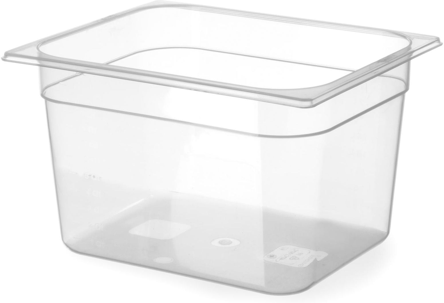 Pojemnik GN 1/2 9,5L z polipropylenu przeźroczysty, nr kat. 880111, wymiary: 325x265x150 mm, marka Hendi Cechy pojemnika z polipropylenu: Transparentny pojemnik z polipropylenu to przystosowane do kontaktu z żywnością naczynie o standardowych rozmiarach GN 1/2: 325x265 mm. Jest to praktyczne i funkcjonalne rozwiązanie dla branży gastronomicznej. Pojemnik z polipropylenu jest bardzo lekki i odporny na uderzenia. Charakteryzuje się łatwością w czyszczeniu i dezynfekcji. Nie wchłania zapachów i smaków, jest półprzezroczysty, bezbarwny. Pojemniki z polipropylenu można piętrować. Można go myć w zmywarkach i używać w kuchence mikrofalowej. Odporność pojemnika z polipropylenu na temperatury od -40°C do temperatury 80°C sprawia, że jego zastosowanie może być bardzo uniwersalne i szerokie. Pojemnik GN posiada umieszczoną na bocznej ściance podziałkę objętości. Dane techniczne Marka: Hendi Linia produktowa: Profi Line Materiał: Polipropylen PP Wytrzymałość na temperatury: °C: -40 do 80 Rozmiar GN: GN 1/2 Wysokość mm: 150 Długość mm: 325 Szerokość mm: 265 Maksymalna objętość L: 9,5 Kolor: transparentny Waga netto kg: 0.47