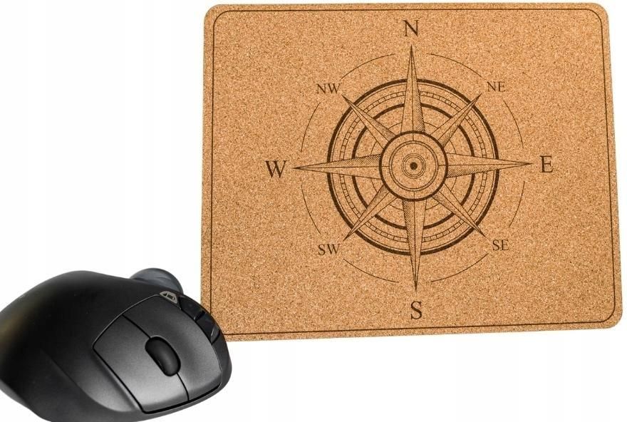Podkładka pod mysz - róża wiatrów. Ozdobna podkładka wykonana z wysokiej jakości korka, grawerowana laserowo. Doskonale się sprawdzi jako ochrona blatu przed jego uszkodzeniem. Cechy podkładek grawerowanych w korku: Każda podkładka jest unikalna, ze względu na strukturę i właściwości korka. To produkt naturalny, w którym mogą zdarzyć się drobne skazy i niejednolita powierzchnia podkładki. Charakterystyczną cechą grawerowania laserowego w korku jest brązowa poświata wokół napisów, kształtów która powstaje pod wpływem temperatury na korek. Bo proces grawerowania oznacza działanie wysoką temperaturą na korek, które zmienia swoją barwę pod jej wpływem. Całokształt cech korka i grawerowania laserowego nadaje unikatowość i niepowtarzalność każdej grawerowanej podkładce.