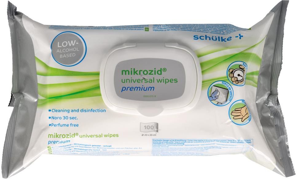Mikrozid universal wipes premium – chusteczki do dezynfekcji powierzchni (Schulke) Mikrozid universal wipes premium – chusteczki do dezynfekcji powierzchni to produkt przeznaczony do szybkiej dezynfekcji powierzchni wyrobów medycznych. Mikrozid universal wipes premium wyróżnia się wysoką kompatybilnością materiałową. Może być stosowany do monitorów urządzeń medycznych, ekranów dotykowych. Skuteczność osiągana jest w krótkim czasie. Zgodnie z EN 16615 w czasie 1 minuty (w warunkach niskiego obciążenia). Chusteczki mikrozid universal wipes premium nie zawierają substancji zapachowych ani barwników, dzięki czemu są bezpieczne i niedrażniące. Produkt znakomicie myje i likwiduje zabrudzenia. Zalecane są do stosowania we wszystkich obszarach podwyższonego ryzyka. Mikrozid universal wipes premium sprawdzą się w sytuacjach, gdy konieczna jest szybka dezynfekcja i szeroka kompatybilność materiałowa. Chusteczki mikrozid universal wipes premium mogą być używane do mycia i dezynfekcji głowic i sond USG. Chusteczki mają działanie bakteriobójcze, drożdżakobójcze, wirusobójcze wobec wirusów osłonkowych (BVDV, vaccinia), adenowirusa, wirusa polyoma SV40, norowirusa, rotaworusa. Działa też prątkobójczo wobec prątków gruźlicy. Chusteczki mikrozid universal wipes premium mają wymiary 20 × 20 cm. W opakowaniu znajduje się 100 sztuk chusteczek. Produkt mikrozid universal wipes premium został przebadany dermatologicznie i jest bezpieczny dla użytkowników. Cechy produktu: gotowy do użycia, do dezynfekcji powierzchni wyrobów medycznych, wysoka kompatybilność materiałowa, bez barwników i substancji zapachowych, do głowic i sond USG, szerokie spektrum biobójcze, chusteczki o wymiarach 20 × 20 cm. Działanie Czas bakteriobójcze, drożdżobójcze (EN 16615) 1 minuta bakteriobójcze, drożdżobójcze (VAH-metoda) 2 minuty bakteriobójcze (EN 13727) 15 sekund drożdżobójcze (EN 13624) 1 minuta ograniczone działanie wirusobójcze 15 sekund polyoma SV40 15 sekund rotawirus 15 sekund norowirus 30 sekund adenowirus 15 sekund prątkobójcze 5 minut Sposób zastosowania: Powierzchnię przeznaczoną do dezynfekcji należy przetrzeć nasączoną chusteczką równomiernie. Pozostawić do wyschnięcia. Opakowanie należy szczelnie zamknąć po każdorazowym pobraniu chusteczki. Należy zwrócić uwagę na całkowite zwilżenie dezynfekowanej powierzchni. W przypadku adenowirusów i mycobacterium tuberculosis należy pozostawić powierzchnię wilgotną podczas całego czasu oddziaływania. Przed przeprowadzeniem dezynfekcji należy usunąć z powierzchni wszelkie widoczne zabrudzenia. Skład produktu: 100 g roztworu, którym zostały nasączone chusteczki, zawiera 17,4 g Propan-2-ol, 12,6 g Etanol (94% w/w).