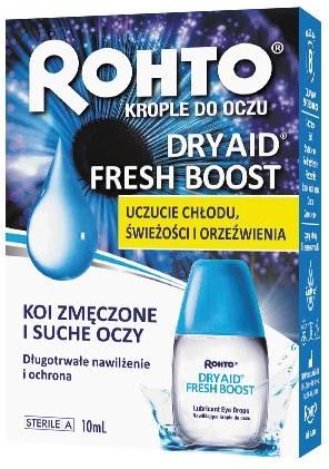 Rohto Dry Aid Fresh Boost krople do oczu, zapewniają uczucie chłodu, świeżości i orzeźwienia zmęczonym i suchym oczom.
