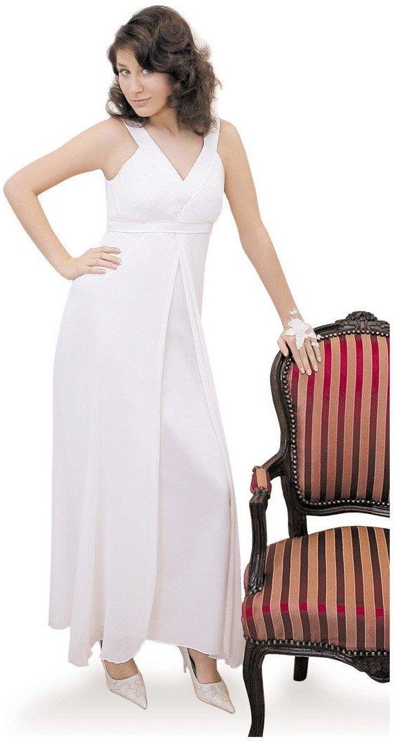 Fason: empire, rozkloszowana Dekolt przód: serek Plecy: dekolt karo Zapięcie: suwak kryty z tyłu Materiał: tkanina zwiewna - szyfon, satyna Długość całkowita: maxi Rękaw: szerokie ramiączka Ozdoby: kreszowanie