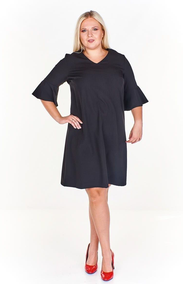 Sukienka z rozkloszowanym rękawem, układająca się w linię trapezu to propozycja dla pań, które lubią stonowane, klasyczne barwy, ale cenią sobie też nieszablonowe podejście do mody. Falbanka, jako zakończenie krótkiego rękawka, jest bardzo dziewczęca, ale nie infantylna, subtelnie odwróci uwagę od …