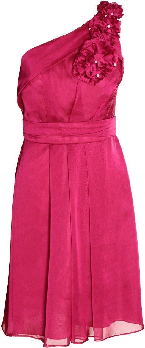 Fason: asymetria, rozkloszowana, odcięta w pasie Plecy: odkryte częściowo Zapięcie: suwak kryty z boku Materiał: tkanina zwiewna - szyfon, podszewka Długość całkowita: mini Rękaw: na jedno ramię Ozdoby: kwiat, perełki