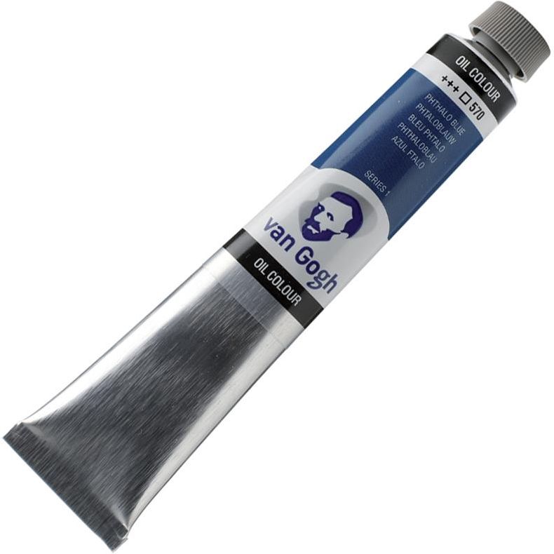 Talens Van Gogh Oil Colour artystyczna farba olejna trwałe i wyraźne kolory wysoka zawartosć pigmentu równomierne rozprowadzenie pędzlem doskonala odporność na światło, dzięki czemu są długotrwałe przeznaczone dla profesjonalistów i początkujących miłośników malarstwa olejnego kolory znakomicie łączą się między sobą, co umożliwia uzyskanie szerokiego spektrum barw i odcieni pojemność tuby 60ml kolor: 570 Phthalo Blue (seria 2) HTML # 0C003E CMYK # 97, 95, 35, 57 RGB # 12, 0, 62 produkt holenderskiej firmy Talens