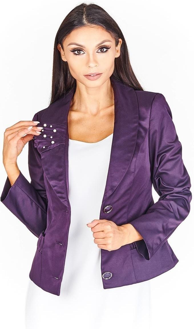 Żakiet uszyty z satyno-bawełny o delikatnym połysku. Na przodzie cięcia francuskie. Kołnierz bardzo dekoracyjny, ozdobiony marszczeniem i perełkami z prawej strony. Górne krawędzie kieszeni również posiadają podobne marszczenia. Rękaw długi. Jest podszewka. Zapinany na 3 duże guziki. Żakiet idealnie komponuje się z sukienką o numerze FSU634, razem tworzą elegancką garsonkę. Komplet można założyć na wiele rodzinnych i biznesowych spotkań, jak również na co dzień do pracy biurowej. PRODUKT POLSKI kupując polskie marki wspierasz rozwój rodaków. Polska rośnie w siłę.