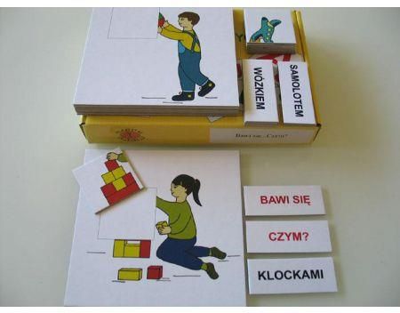 Zestaw. Bawi się... Czym? Zestaw. Bawi się... Czym? służy do nauki dopasowywania małych elementów do całości, dopasowywania rzeczownika w odpowiedniej formie do obrazka, odpowiedzi na pytania: Czym się bawi?, przez podanie etykietek lub wypowiedź oraz czytanie wyrazem. Zestaw plakietek i etykietek służy do: przenoszenia obrazów z rzeczywistości na obrazki, uświadamianiu dziecku, że słowo (napis) oznacza konkretną rzecz, czynność czy sytuację, nauki czytania. Uczy dziecko rozumienia pytań oraz udzielania odpowiedzi. Zestaw. Bawi się... Czym? zawiera 8 plansz 8 elementów obrazkowych 10 etykietek opisowych opis przykładowych ćwiczeń Materiał: tektura Opakowanie: woreczek + pudełko tekturowe