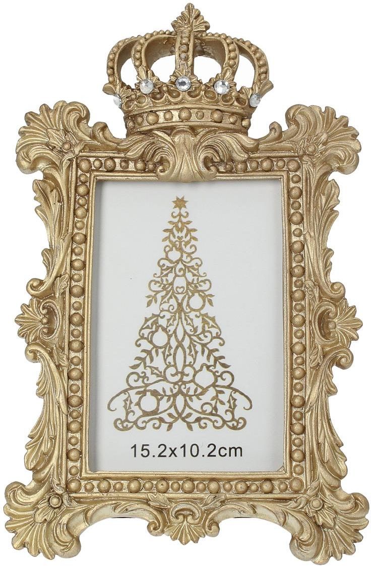 Złota ramka na zdjęcia z królewskim akcentem. Elegancka ramka Majesty to kwintesencja luksusu i wyrafinowanego stylu. Zdobiona finezyjnymi ornamentami, zakończona majestatyczną koroną, doda każdemu zdjęciu szlachetności i wyjątkowego charakteru. Perfekcyjnie sprawdzi się jako dekoracja w salonie, sypialni czy gabinecie, podkreślając elegancję wnętrz w stylu glamour, vintage lub klasycznym. Jej złoty odcień wprowadzi do przestrzeni nutę blasku, czyniąc wspomnienia jeszcze bardziej niezapomnianymi. Tylna strona ramki wyposażona w stopkę. Ramka przeznaczona na zdjęcie o wymiarach: 10,2 x 15,2 cm.Wymiary: szer. 17 cm, gł. 4 cm, wys. 27 cm.Materiał: polyresin.