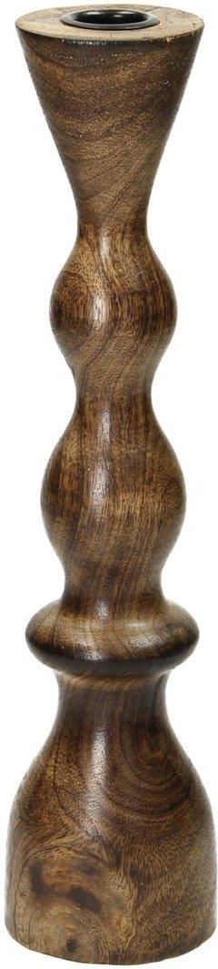 Elegancki świecznik drewniany w naturalnym kolorze. Duży świecznik wykonany z drewna mango przypadnie do gustu wszystkim miłośnikom naturalnych ozdób. Ta stylowa dekoracja w ciemnobrązowym kolorze o widocznych słojach, doskonale zaprezentuje się w pomieszczeniach urządzonych w stylu boho, rustykalnym czy kolonialnym. Skomponuj go z dodatkami o podobnej stylistyce, zapal świece i delektuj się nastrojowym efektem w Twoim domu. Świecznik przeznaczony na pojedynczą, długą świecę. Wymiary: szer. 7 cm, dł. 7 cm, wys. 30 cm.Materiał: drewno mango.