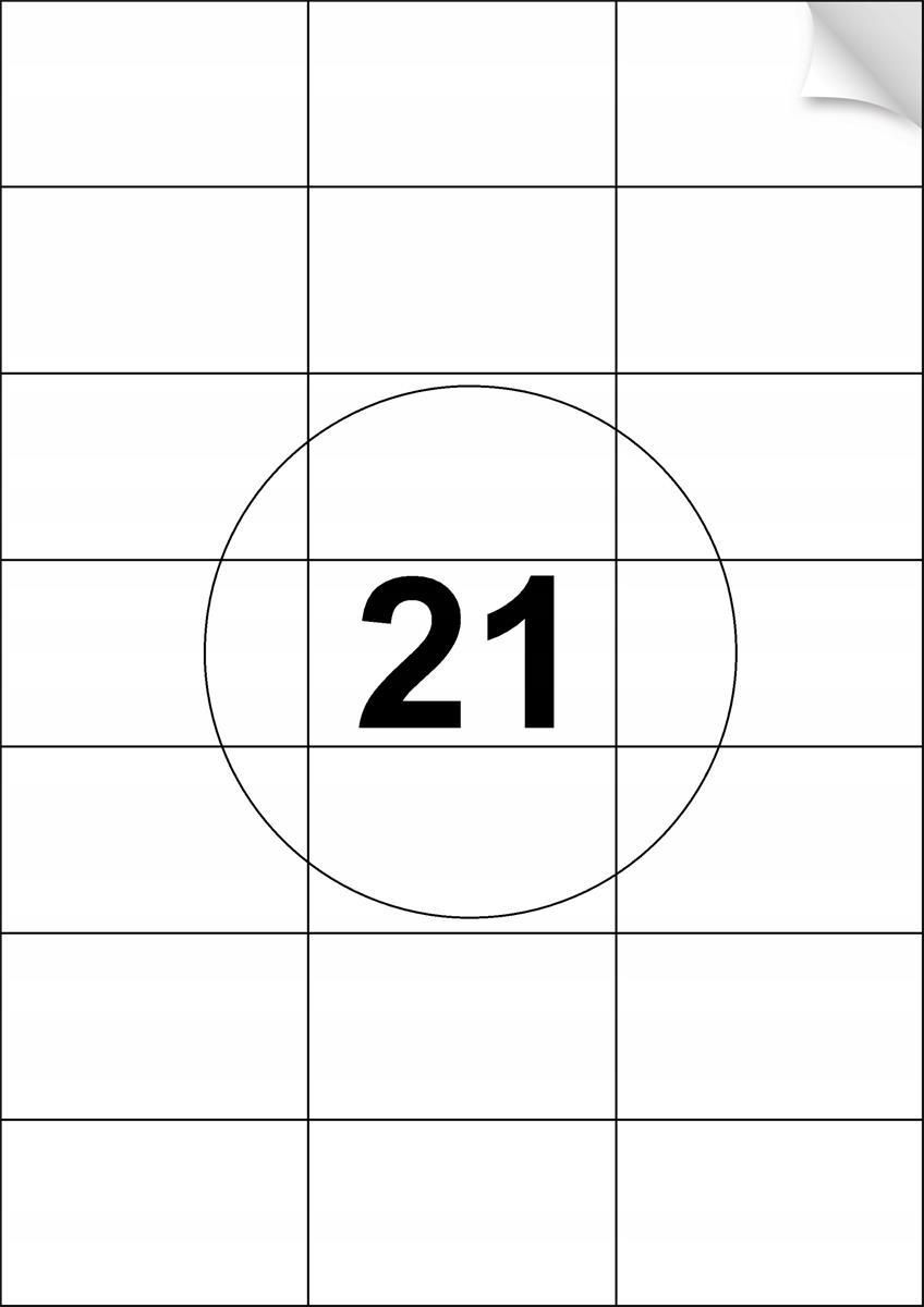 21 etykiet samoprzylepnych 70x42,3mm na arkuszu A4 Etykiety dedykowane do wszystkich typów drukarek atramentowych, igłowych, laserowych oraz kserokopiarek Parametry: Rozmiar etykiety: 70x42,3 mm Rozmiar arkusza: A4 Ilość etykiet na arkuszu: 21 sztuk OPAKOWANIE ZBIORCZE: 20 sztuk Ilość arkuszy w opakowaniu: 100 sztuk Ilość etykiet w opakowaniu: 2100 sztuk Rodzaj papieru: matowy offsetowy Klej: permanentny Kolor etykiety: biały Temperatura działania od -10 C do +50 C Zastosowanie: logistyka, biuro, znakowanie Przeznaczone do drukarek: laserowych, atramentowych, ksero