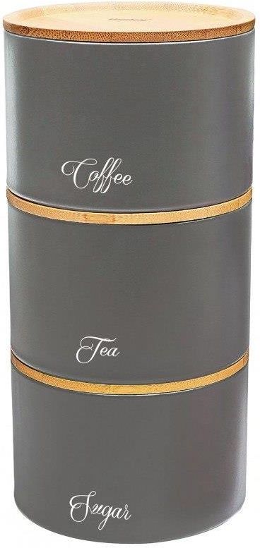 Zestaw 3 pojemników z pokrywkami bambusowymi do przechowywania produktów sypkich typu herbata, kawa, cukier. Produkt firmy KLAUSBERG Korpus z lakierowanej stali nierdzewnej w kolorze szarym (półmat). Na pojemnikach białe napisy Sugar, Coffee, Tea. Pokrywy wyposażone w silikonowe uszczelki aby …