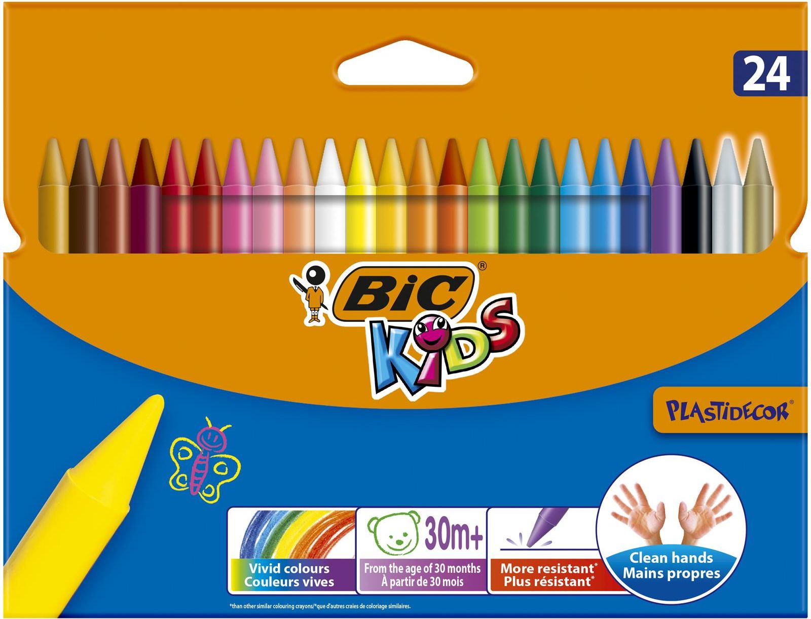 BIC Kids Plastidecor kredki świecowe opakowanie 24 kolory - Niebrudząca kredka świecowa - Idealna dla małych dzieci, już od 30 miesiąca życia - Niebrudząca rąk i ubrań - Dostępna w 24 żywych kolorach - Łatwe temperowanie - Nietoksyczny produkt bezpieczny dla dziecka - Mocniejszy grafit