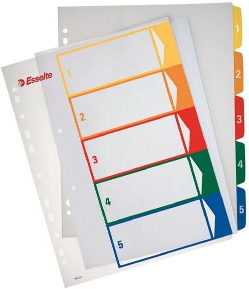 Przekładki do wielokrotnego użytku, bardzo wytrzymałe, w żywej tonacji kolorystycznej. Z kartą do indywidualnego zadruku na komputerze. Mocne i wytrzymałe, dzięki wykonaniu z bardzo odpornego polipropylenu. Format A4+ pozwala na szybki dostęp do dokumentów, nawet w przypadku przechowywania ich w koszulkach. Wzorzec do zadruku do pobrania ze strony: www.esselte.com/easyprint Cechy produktu: - kolorowe, zadrukowane numerycznie przekładki do łatwego sortowania - ilość przekładek: 5, 6, 10, 12 - mocny przezroczysty PP o grubości 0,3 mm - 11 uniwersalnych otworów umożliwiających wpinanie do segragatora - format: A4+ - wymiary: 245 x 305 mm - zwycięzca konkursu Red Dot Design Award - mix kolorów