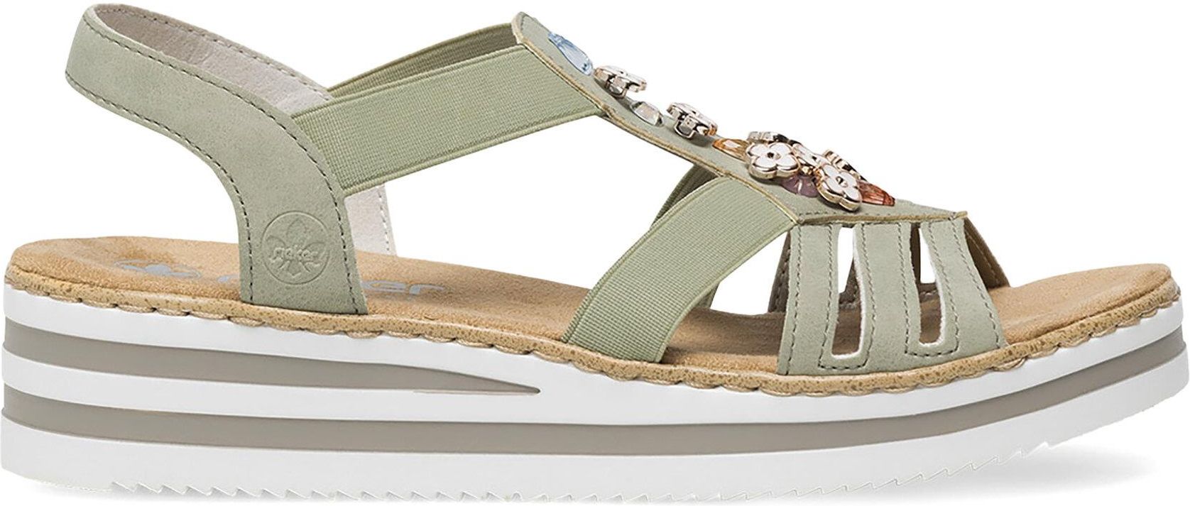 Odkryj komfort i styl w jednym z tymi sandałami marki Rieker! Te zielone, casualowe buty to idealny wybór dla kobiet ceniących sobie wygodę i modny wygląd. Sandały na koturnie optycznie wydłużą Twoje nogi, a do tego będą pięknie się prezentować. Ich uniwersalny design sprawdzi się w wielu letnich stylizacjach. Wybierz sandały Rieker i ciesz się każdym krokiem! Od ponad stu lat marka Rieker oferuje niezwykle komfortowe i trwałe obuwie, które powstaje z myślą o zdrowiu stóp. Dzięki wieloletniemu doświadczeniu w produkcji obuwia, ta niemiecka marka doskonale potrafi łączyć wygodę ze stylem, dlatego w ofercie znajdziesz buty w modnych, oryginalnych fasonach, które każdemu przypadną do gustu. Buty Rieker tworzone są z materiałów wysokiej jakości, przez co odznaczają się wyjątkową elastycznością i trwałością, ale też lekkością. Ponadto w obuwiu stosuje się szerszą formę zapewniającą odpowiednią stabilizację stopy, specjalne podeszwy absorbujące wstrząsy oraz odciążające stawy i kręgosłup, a także wyjmowane wkładki z pianki Memory Foam, która idealnie dopasowuje się do kształtu stóp. To doskonałe produkty dla tych, którzy ponad wszystko cenią sobie komfort. Przekonaj się!